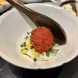 Round minced pork cutlets are thoroughly shredded and mixed into risotto-style rice with takuaya and cheese.