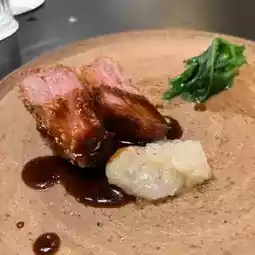 Beef-like lean Dorobuta shoulder loin is served with demi-glace sauce. Low-temperature cooked turnip is also served as a sauce.