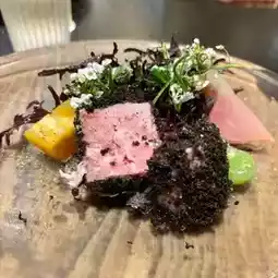 A salad of low-temperature cooked Satsuma Chami pork fillet covered in bamboo charcoal breadcrumbs. Refreshing with Iyokan dressing.