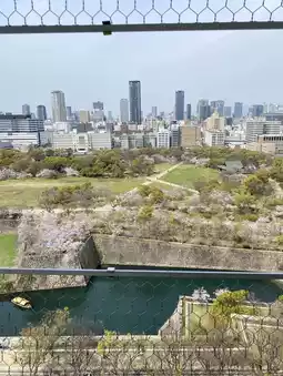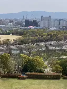 From the castle tower, you can see the Nishinomaru Garden and the cherry blossoms on the perimeter. However, the observation deck is over 50 meters below, so the green trees stand out from a distance. It is recommended to view the cherry blossoms at Osaka Castle from the ground.