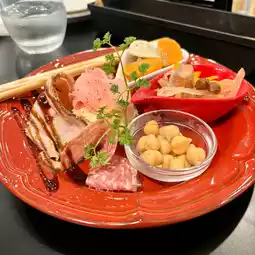 Pickles, fresh fish escabeche, vinegar-marinated chickpeas, potato salad, roast pork, and Milan salami on one plate.