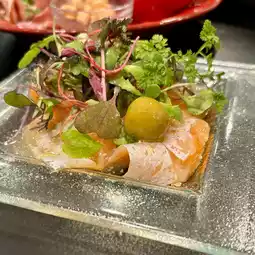 Today's dish is Mount Fuji salmon. It has a light yet firm taste with some fat. It is also served with freshly pickled hand-picked olives from Iki Island.