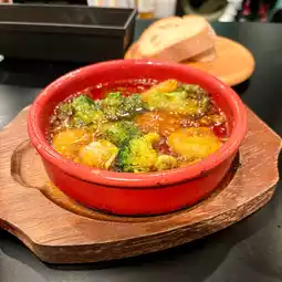 The ingredients are soaked in plenty of garlicky olive oil, making it addictively delicious. It is also served with a baguette.
