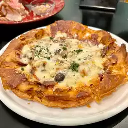 Enjoy the crispy texture of pie crust. It's like a pizza with melted cheese on top of a meat pie.