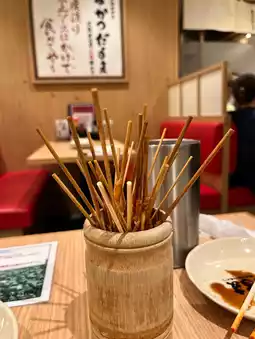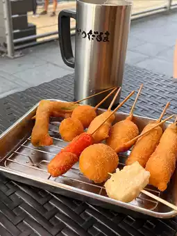 Daruma Kushikatsu is a famous fried skewer shop in Dotonbori, Osaka Prefecture, Japan. It is a shop with many branches in Japan. The branch we went to is located next to the Ebisu River. There is a giant sign of an old man in front of the shop. During the day and evening, there are many people. I recommend going in the afternoon. There are both indoor and outdoor seats. You can order food via tablet and pay at the counter.