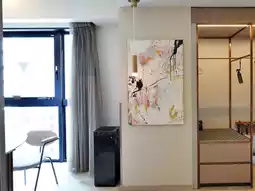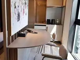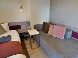There is a seating area on one side of the room, which is equipped with a comfortable sofa and a small coffee table, which is a perfect place to relax and rest. I like to sit here and read or chat, enjoying a moment of peace and relaxation.