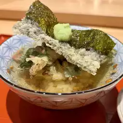 I chose tempura, which is made by putting kakiage on rice and serving it as ochazuke. The light tempura is light and can be enjoyed with tea broth and wasabi.