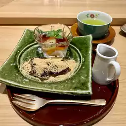 The aroma of hojicha and the soft, chewy warabi mochi are drizzled with brown syrup. The gently sweet compote made with figs and kiwis is the perfect dessert after enjoying the tempura.