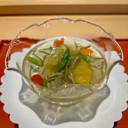 A refreshing summer dish made with jade eggplant, paprika, tomato, and water shield. You can enjoy the deliciousness of the ingredients. Among them, Junsai, with its smooth and bouncy texture, is in season right now.