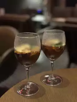 A wine glass is filled with lots of mushrooms, and hot soup is poured into it.