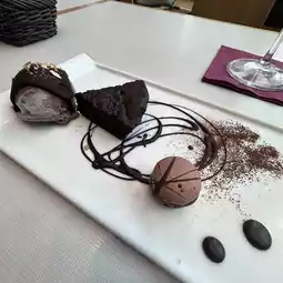 A plate of small chocolate ice cream, macarons, and chocolate cake