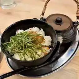 Plum chazuke served with soup stock in a claypot. The aroma and sourness of pickled plums add an accent to the clean, refreshing flavor.