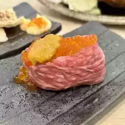 Meat sushi with sea urchin and salmon roe wrapped in beef sashimi. A masterpiece that will grab the hearts of meat lovers.