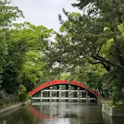 When it comes to Sumiyoshi Taisha's most famous tourist attraction, it must be the Taiko Bridge! This bridge pier was donated by Yodo-kun, the concubine of Toyotomi Hideyoshi, during the Keicho period. Vermilion-colored, high-angle arched bridge
