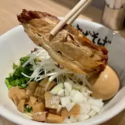 The topping is two slices of Jinrui Mina Noodles' standard extra-thick, melt-in-your-mouth char siu. For an additional 150 yen, we offer a special boiled egg on top.