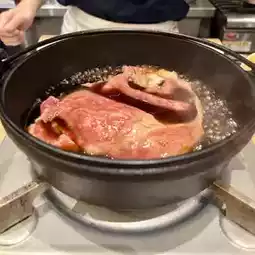 The large-sized specially selected Japanese black beef is very satisfying. The meat is chewy yet soft, with a fine texture. It is moist, vibrant red meat with milky white marbled fat. It melts in your mouth.