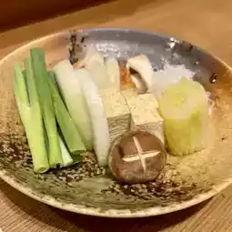 There are nine kinds of vegetables: Chinese cabbage, green long onion, white leek, onion, shiitake mushroom, king oyster mushroom, shirataki, tofu, and chikuwa.
