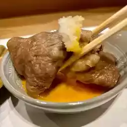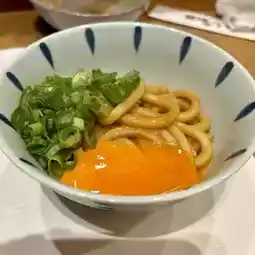 You can choose between rice porridge or udon noodles for the final course. The udon noodles, served with a dipping sauce packed with the flavors of vegetables and beef, are exquisite. Top with egg yolk and spring onions.
