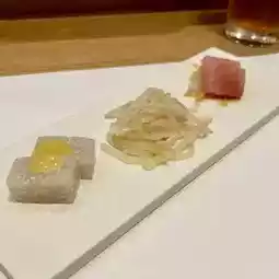 The appetizer is a platter of three dishes: konnyaku roe with vinegared miso, bean sprout namul, and tuna sashimi. The bean sprout namul is exquisitely seasoned and delicious, stimulating the appetite.
