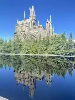 Hogwarts Castle reflected on the water on a sunny day is very beautiful! At night, it shows a different face.
