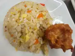 The fried rice contains eggs, green onions, and carrots. It has a smooth surface, moist texture, and is slightly soft.