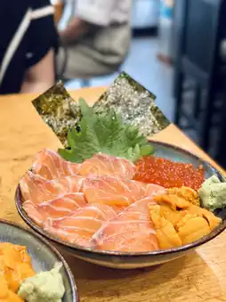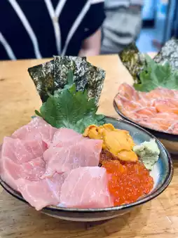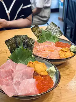 If like me you don’t want to get up early🤪, you can actually eat at other stores or buy in the market and go to the standing area to eat. I went to the seafood bowl next to the seafood bowl specialty store. I waited in line for 10-15 minutes to be seated. The cod and seaweed were the best, very fresh and sweet🤤