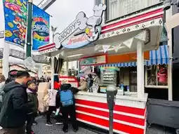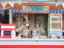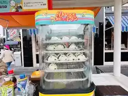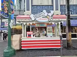 This is a Snoopy-themed snack cart located inside Universal Studios Japan. The shop is decorated in red and white with a large bone sign. The food menu focuses on snacks, such as Snoopy-shaped steamed buns for 650 yen and Snoopy donuts for 500 yen. Drinks are also available.