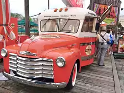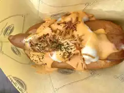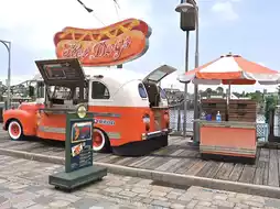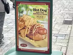 This is a hot dog cart in a cool red classic car. This shop is located in Universal Studios Japan. It sells only one menu: hot dogs. This hot dog is called Hot Dog Chilli with Cheese Sauce. People often line up to buy it because it tastes delicious. It has a little bit of spiciness from the meat sauce and crispy naso. It's also easy to eat and doesn't have to wait long.