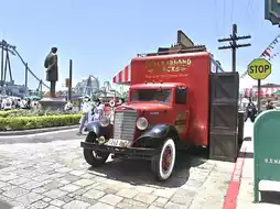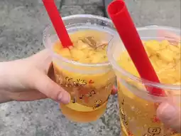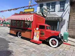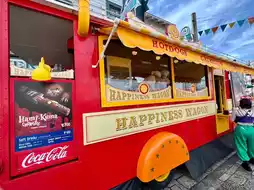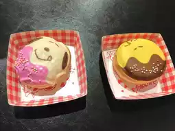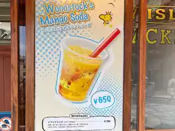 This food cart is located in Universal Studios Japan. The shop is a bright red truck. The menu items are Snoopy-themed, with two options: Snoopy-shaped donuts and mango soda drinks.
