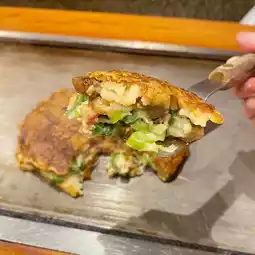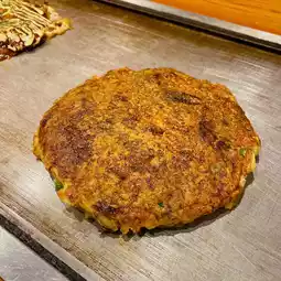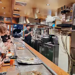 Being seated in front of the bar was very atmospheric. In addition to the classic Okonomiyaki, this restaurant's specialty is the "Green Onion Okonomiyaki", so we tried the most popular assorted Okonomiyaki and beef green onion Okonomiyaki. The Okonomiyaki here is moist and fluffy and comes with a lot of sauce. The beef and green onion Okonomiyaki is in a more solid pancake shape, with a richer flavor and very soft beef. Both are cooked upon order and placed on the stove in front of you to keep warm, saving us tourists the trouble of worrying about not knowing how to cook and wasting the meal.