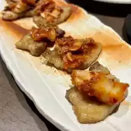 This dish of thickly sliced pork belly topped with kimchi is a perfect combination of juicy fat and the spicy kimchi, giving it a rich flavor and leaving you feeling satisfied with just one bite.
