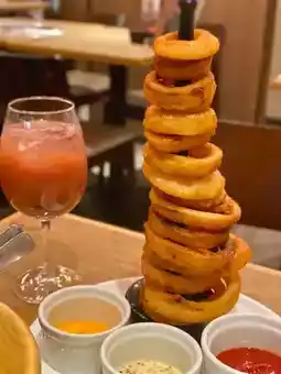 The onion rings stacked like a tower are crispy and the onions inside are sweet and juicy.