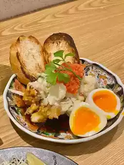 Potato salad with a sweet sauce topped with bread, eggs, and mentaiko 💕