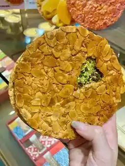 The pistachio pie is a unique pie with a Florentine pie topped with pistachio sweet potato, chocolate cream, and chocolate chips!