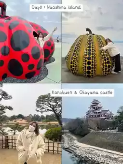 🚦Day 2: Universal Studios Japan (Osaka Prefecture)‣ Target Mario zone🚦Day 3: Naoshima island (Kagawa Prefecture)‣ Go cycling to find Auntie Yayoi's pumpkins‣ Continue to Korakuen Garden and Okayama Castle