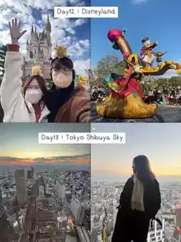 🚦Day 11: Tokyo shopping (Tokyo Province)‣ Shopping, walking around Shinjuku, grabbing dolls 🚦Day 12: Disney Land (Chiba Province)‣ Focus on watching the parade, reminiscing about your favorite cartoon characters 🚦Day 13: Tokyo Shibuya sky (Tokyo Province)‣ Walking, relaxing in Tokyo‣ Going up to see the last light of 2022 at Shibuya sky