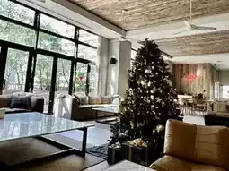 - The lobby is decorated in a light industrial style with green plants, which makes it feel simple and relaxing.