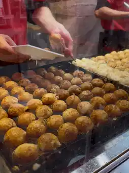 Takoyaki Wanaka Dotonbori is a must-visit spot for takoyaki lovers, having been featured in the Michelin Guide for three consecutive years. Known for its exceptional takoyaki, the shop draws long queues, but the wait is more than worth it. One of their specialties is the Takosen—crispy rice crackers sandwiching warm, flavorful takoyaki for a delicious, crunchy twist.