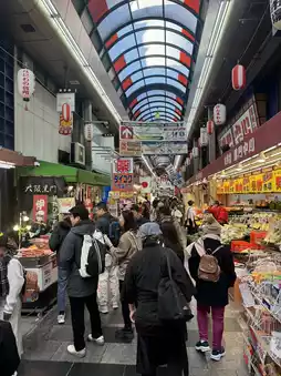 • Kuromon Ichiba Market – Try fresh seafood, sushi, giant squid skewers, and Japanese sweets