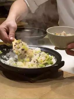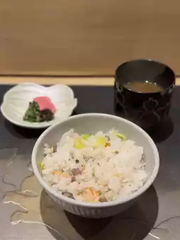 The fragrant rice perfectly matches the flavor of sakura shrimp and the umami of Wagyu.