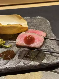 The vacuum-cooked Wagyu mixed with egg yolk offers an exquisite taste.
