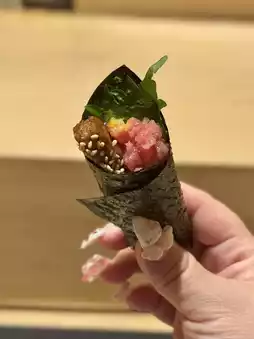 The crispy seaweed combined with Wagyu and medium fatty tuna is surprisingly delicious.