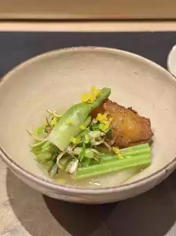 Vacuum-cooked Wagyu, needlefish sushi, broad beans, sea bream roe, baby scallops, lily bulb petals, thick omelet, Numata-style.
