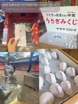 At Sumiyoshi Taisha, rabbits are considered divine messengers. This belief is tied to the shrine's founding day approximately 1,800 years ago, which coincided with the year, month, and day of the rabbit (辛卯の年, 卯月, 卯日). Hence, rabbits🐇 became divine messengers.