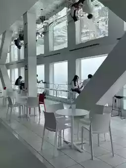 There is a "River View" area with tables and chairs where you can enjoy takeout drinks and sweets.