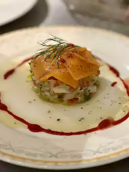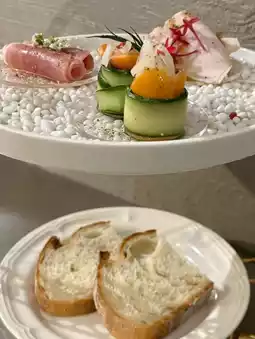 The appetizers—prosciutto, salmon marinade, roast pork, and bread—each highlight the ingredients, with an outstanding pairing of prosciutto and bread. The low-temperature cooked carpaccio offers a unique texture and flavor of each part, with an exquisitely moist and tender finish. The smoked salmon and avocado marinade harmonizes rich flavors, delivering a delightful surprise with every bite.