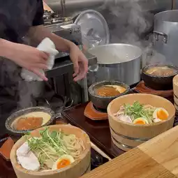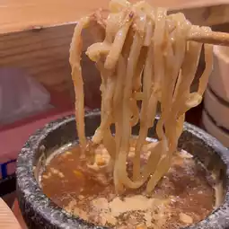 The noodles come in a hot spring bucket, and the soup is simmered in a stone pot.