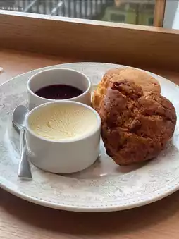 The scones are crispy on the outside and fluffy inside, perfectly paired with clotted cream and homemade jam.