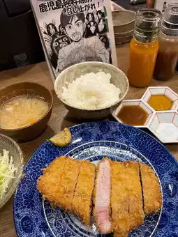 Tonkatsu pork cutlet shop in Osaka. This place uses premium Kurobuta pork. The price might be high, but the meat quality is excellent. Today we ordered the tonkatsu pork cutlet set. Here, you scan to order. The pork is delicious and tender, fried to a crisp. The pinkish color means it’s cooked and safe to eat. For us, it’s really tasty and very satisfying. We waited in line for over an hour because the shop is small with limited seating, and there are a lot of foreigners.