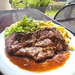 Sirloin steak lunch. The portion is large and comes with vegetables. The cake is soft and fluffy, and the cream on top is super, super delicious.